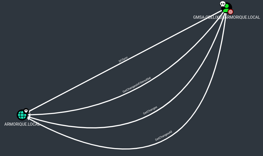 After compromising the gMSA-obelix$ account, we see that it has GetChangesAll permissions, meaning it can perform a DCSync of the armorique.local domain, which means it has been compromised :