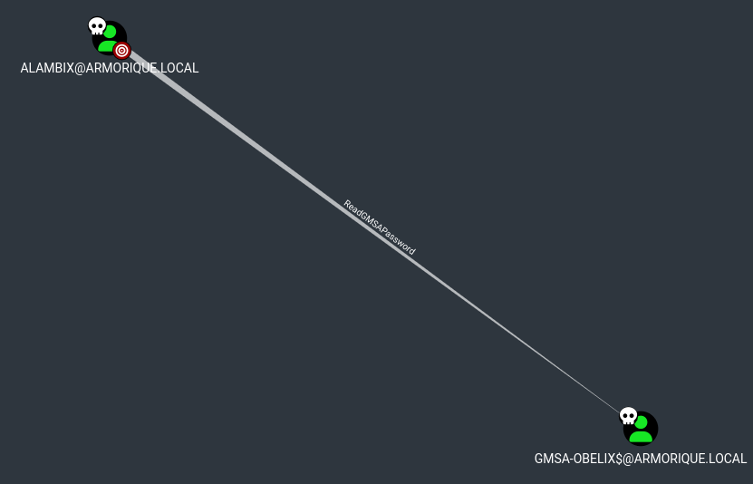 When we open Bloodhound, we see that the user alambix has ReadGMSAPassword permission on the user gMSA-obelix$, which means he can read the gMSA (Group Managed Service Account) password of the gMSA-obelix$ account :