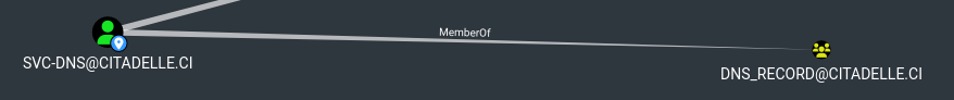 BloodHound shows svc-dns is in the dns-record group (can create DNS records) :
