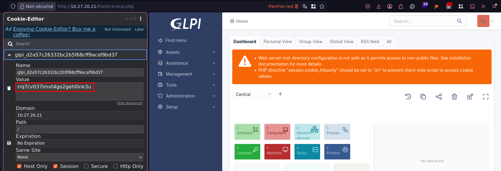 Importing that session into the browser logs us in as GLPI SuperAdmin: