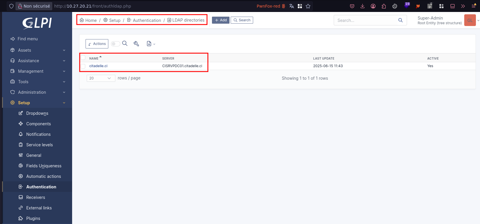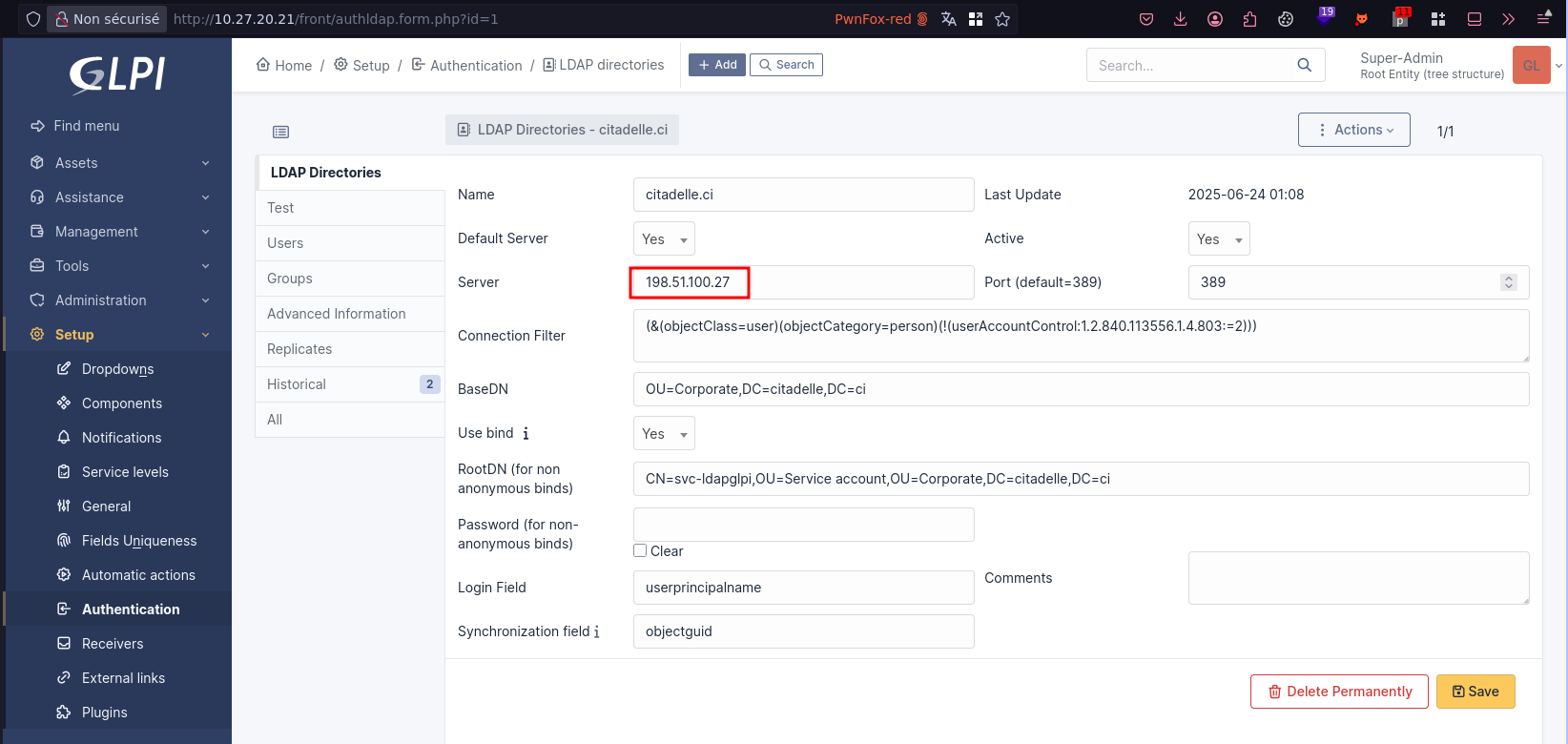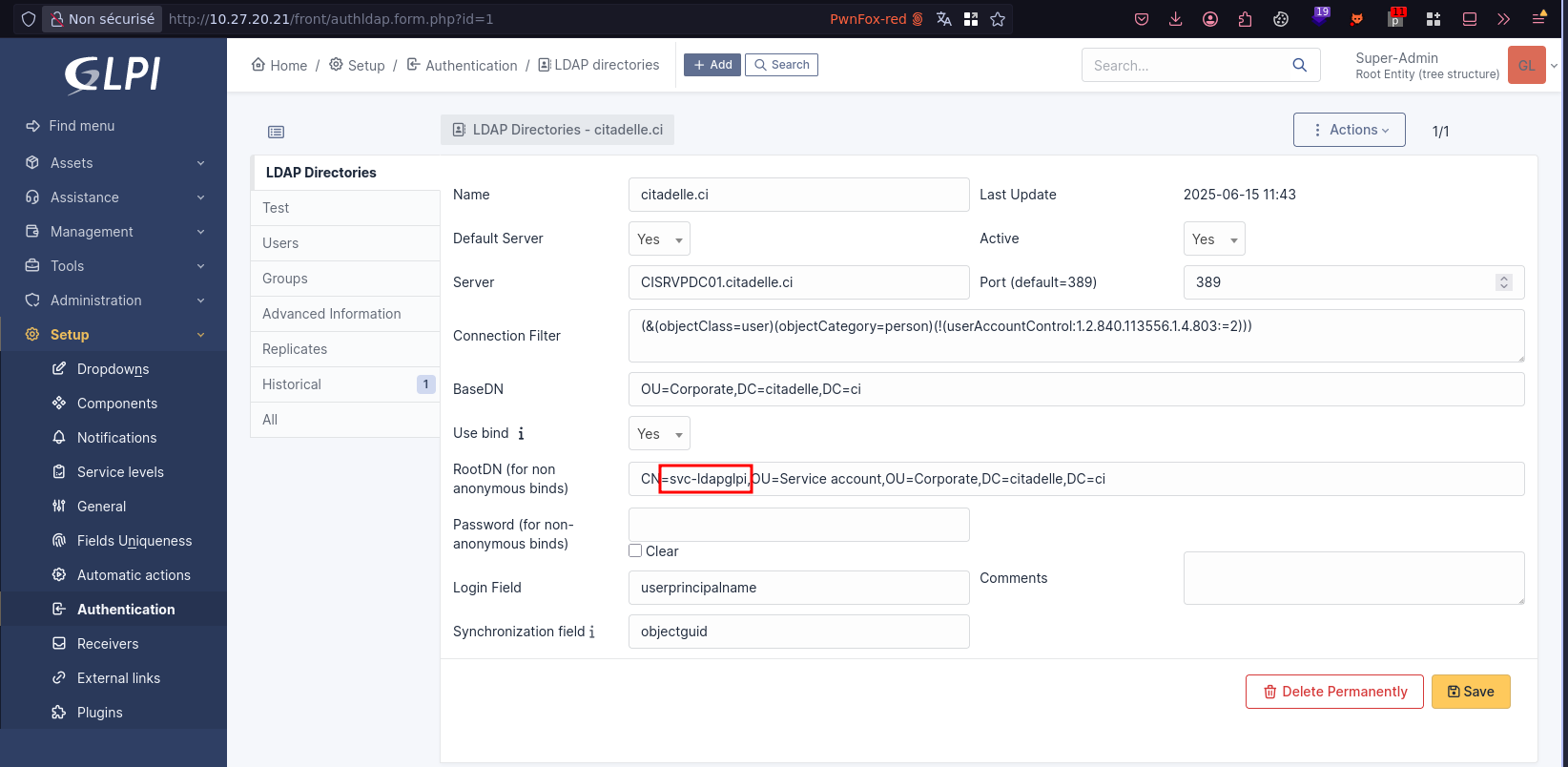 Now that we’ve gained administrator access to GLPI, it’s time to move on to some post-exploitation. One particularly interesting angle is to look into the synchronization between GLPI and the LDAP directory service of the Active Directory environment. We noticed on the login page that domain accounts can be used to authenticate, which strongly suggests that GLPI is configured to connect to the domain’s LDAP server.
